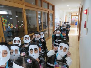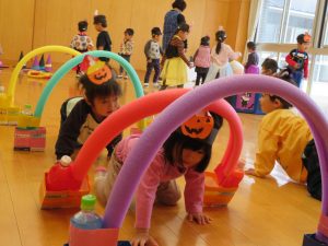 トリックオアトリート❣お菓子をくれなきゃいたずらするぞ~👻と年中の子どもたち。満3歳さんは遊戯室でハロウィンパーティー♪それぞれの楽しみ方をしました。