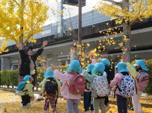 マスカットスタジアムの外周を歩きながらあちこちでどんぐりを拾いました。大きいどんぐり、小さいどんぐり、たっくさん落ちていてどんぐりバックはいっぱいになりました。イチョウの落ち葉もまるで絨毯のように降り積もっていました。両手ですくって落ち葉のシャワー!!秋を満喫しました。