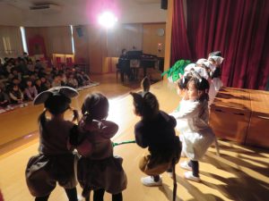 今日はなかよし発表会の予行演習1日目(満3、年少)でした。衣装もつけて小道具も用意して本番さながらに演技しました。1週間後が楽しみです。
