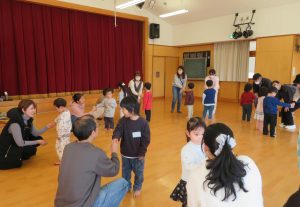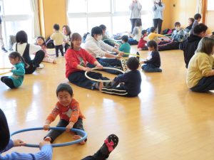 今日は、年少きく組の親子リトミックをしました。おうちの方とニコニコ(^^♪リズムにのって歩いたり走ったり・・・楽しかったね💛