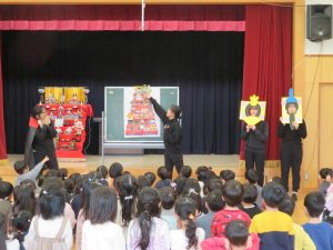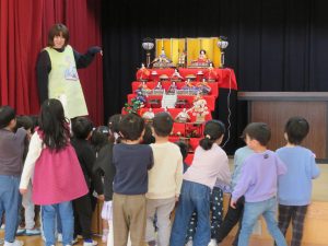 誕生会の後にひな祭り会をしました。クイズを交えながらひな飾りを見ました。
