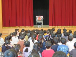 1月の誕生会の後はお楽しみ会、今回はお正月にちなんだ紙芝居です。獅子舞の獅子頭がアップで登場した時は、みんな息をのんで身を乗り出していました。
