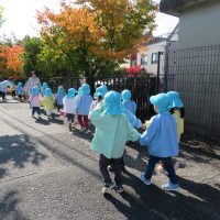 お散歩に出発!さくらの葉も赤く色づいてきれいな道を通りました。 車がたくさん通る道の横も通りました。横断歩道も手を挙げて渡り、景色を楽しみながらも交通安全に気を付けて歩きました。
